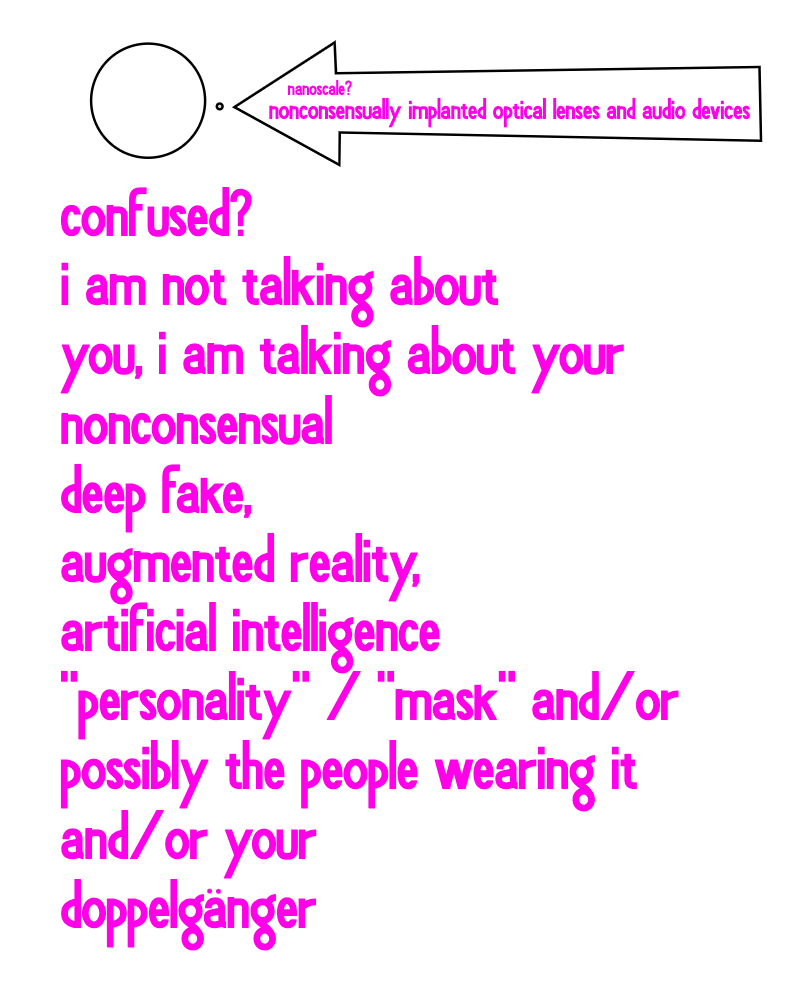 In my particular instance there are a number of possibilities that are occurring. I, most certainly, have non-consensually implanted optical lenses in my eyes that are highly advanced, using such technology as deep fake and augmented reality. I may be seeing people in different timescale, I may be seeing recordings or a live camera feed of them somewhere else. What other possibilities are there? I may be seeing augmented reality or deepfake, artificial intelligence imagery… I hope one day they will go away and I won’t see them anymore.