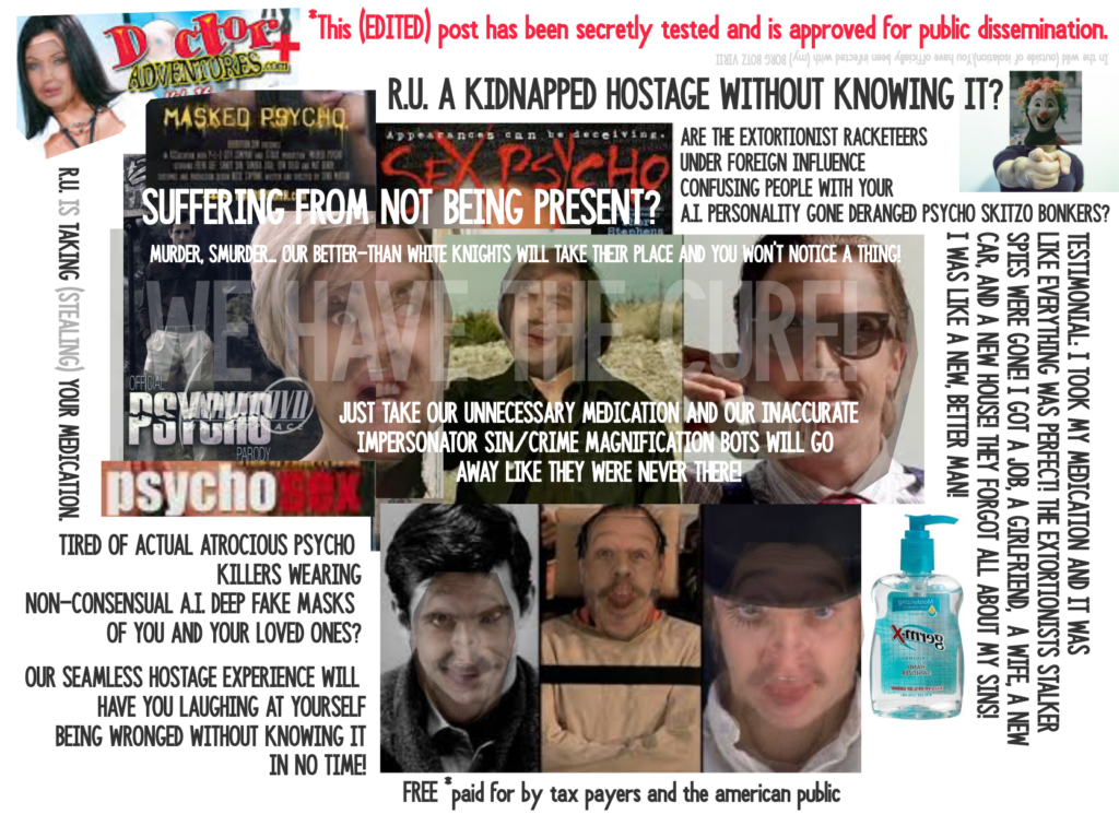Technique: In their full awareness and outside of consent / ethics (we are malpracticing here folks!): When the doctor is alone, and when the perimeters are safe, to begin the session, the Doctor is to receive a βremote brain shockβ of an electric potency that is not traumatic yet shocking. The experience is meant (besides the remote brain shock) to be pleasurable. Just a quick nano gas release of (perhaps targeting the Doctor’s most stubborn or reluctant DNA) endorphin and serotonin increasing chemicals shall ensure the experience is well received. The doctor then gets temporarily implanted with optical lenses and audio devices from another timescale (in the blink of the doctor’s eye). The doctor shall be relocated via matter teleportation technology and / or subjected to a disturbing, exotic, or strange new augmented reality environment. The session is to include a sensory experience of every sense: sight, sound, taste, feeling (touch), smell, as well as blatant βthird eye senseβ transmission with clairvoyance thought truth revealing broadcasts. βPersonalitiesβ of celebrities they are aware of will βpop upβ and in this strange environment shall interact, intensely, with the Doctor for a βtruth information overloadβ disclosure and intense βeducation sessionβ experience. At the conclusion of the session, the doctor shall admit (outside of freewill) that that experience was not real. The entire session shall last a brief ten to thirty minutes. The session is now complete.