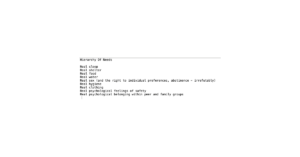 Hierarchy Of Needs Real sleepReal shelterReal foodReal waterSex (and the right to individual preferences and/or abstinence – irrefutably – this can be achievable without any interactions with anyone else.)Real hygieneReal clothingReal psychological feelings of safetyReal psychological belonging within peer and family groups
